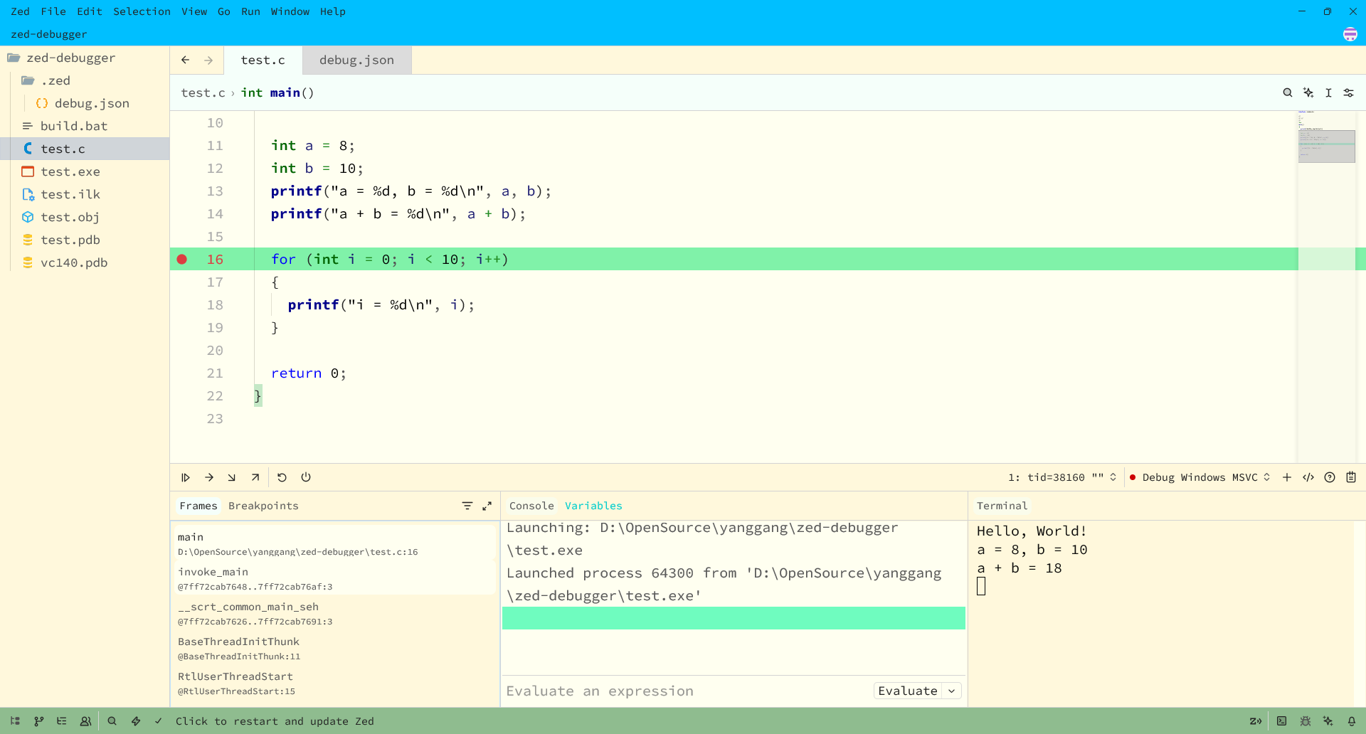 如果你已经生成了待调试的目标程序 test.exe,那么可以在某一行设下断点,然后按 F4,选择 Debug Windows - LLDB,Zed 编辑器会自动下载并启动 CodeLLDB 并加载 test.exe,然后开始调试。