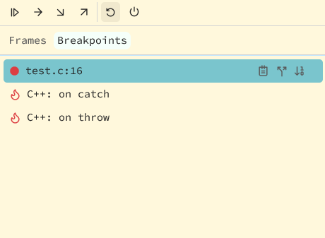 在左侧上部的按钮可以用来 Continue/StepIn/StepOut 等,Frames 则显示当前的调用栈,Breakpoints 中可以看到设置的断点信息。