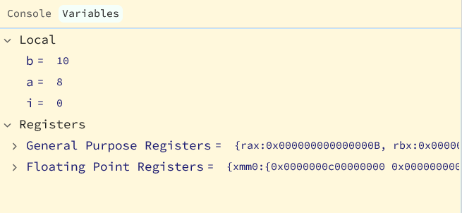 在中间的 Console 中可以使用调试器的命令,Variables 中则显示了当前的变量及寄存器信息。