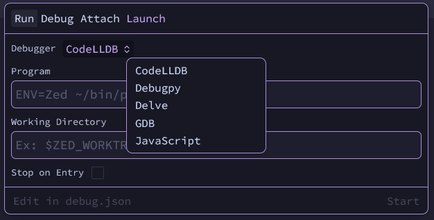 前些天分享了一些关于 Zed 编辑器的配置,有评论提到 Zed 文档中 debug 相关配置的介绍有些简陋。虽然当时在评论中已经说的差不多了,但为了更便于检索,还是将其拎出来,独成一文,也希望能给尝试使用 Zed Debugger 的朋友一些帮助。
